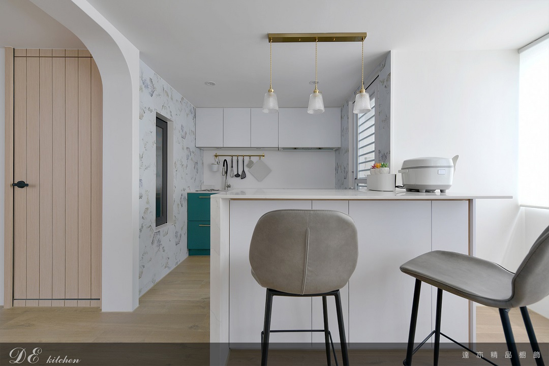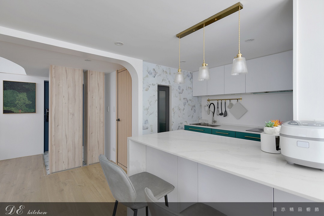 設計團隊以「開放吧檯 × 高機能收納」為核心,結合綠色下櫃與白色島檯的柔和對比,讓廚房不僅是烹飪空間,更成為家的交流中心。