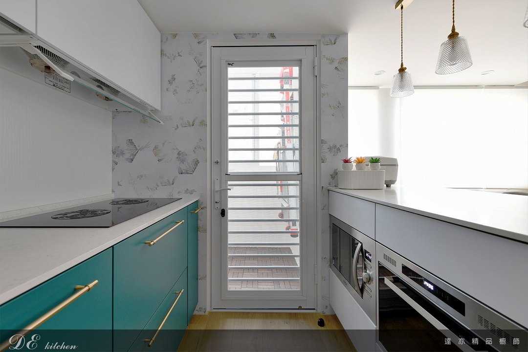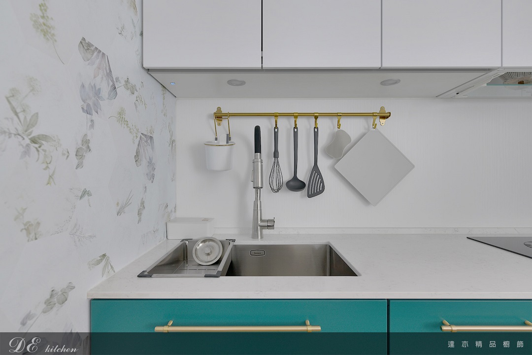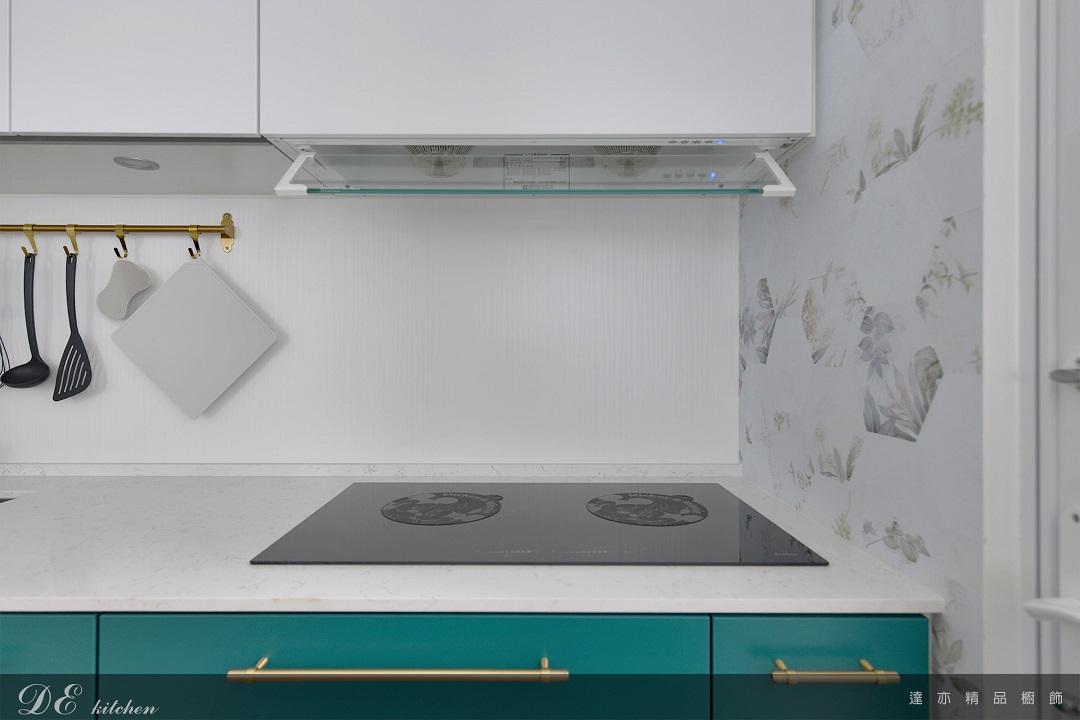柔白光源映襯綠色櫃體的沉穩質感,讓每次備餐都多一點儀式感。
