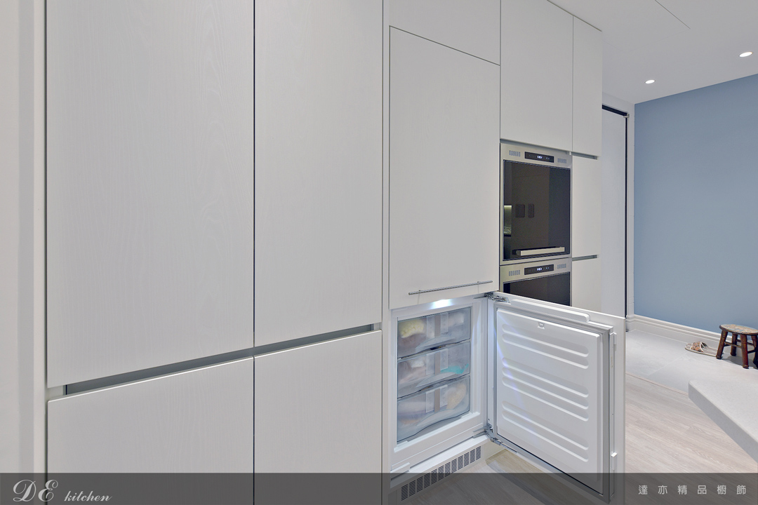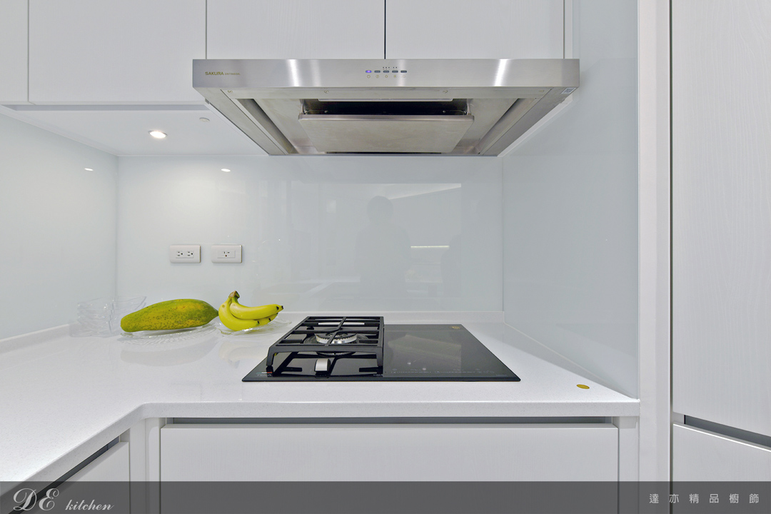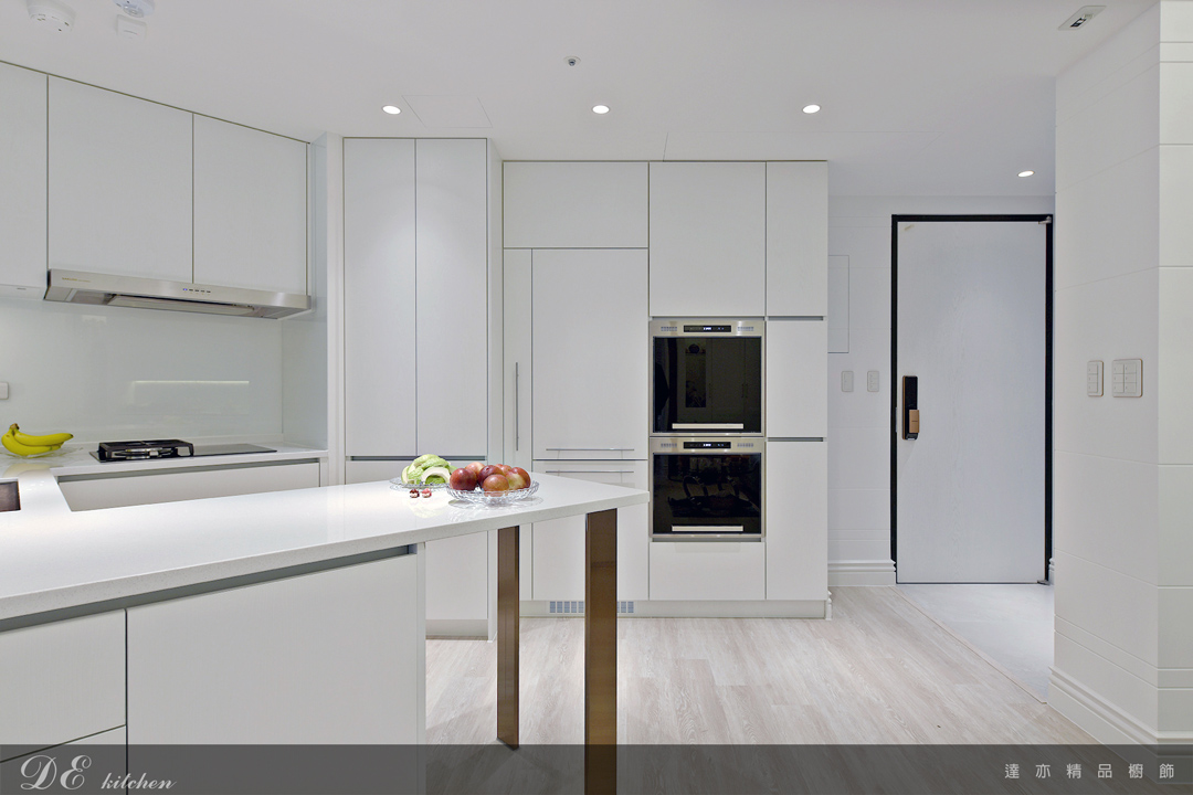 台北市精華地段的小宅廚房設計,不規則的空間深度規劃後純白的輕奢氛圍彌漫整體室內裡。